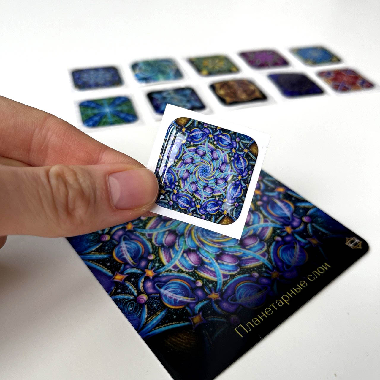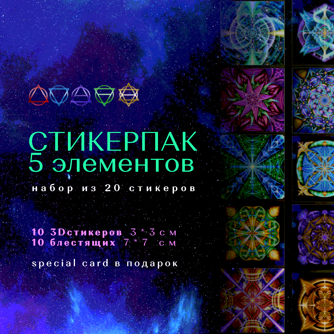 Набор из 20 стикеров с энергией стихий + подарки. 10 3D-стикеров (3×3 см) и 10 блестящих квадратных (7×7 см) с авторскими символами, отражающими энергию и вибрацию огня, воды, воздуха, земли и их соединения - эфира. Яркий дизайн, глубокий смысл — для вдохновения, декора и энергетической поддержки. В подарок: бархатный мешочек для хранения и эксклюзивная карточка-талисман из закрытой коллекции энергосимволов.